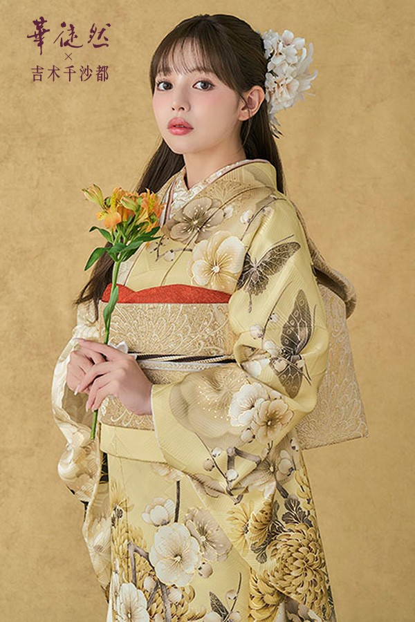 淡く柔らかなイエロー×ダークブラウンの重厚感と高級感あふれる振袖。
