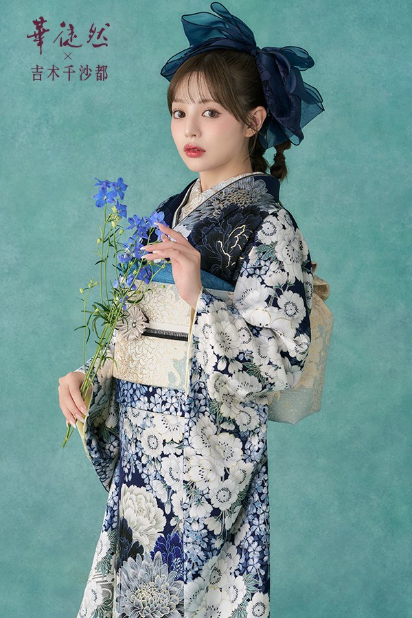 幻想の華をクールに纏う、ネイビーカラーの振袖-HT213