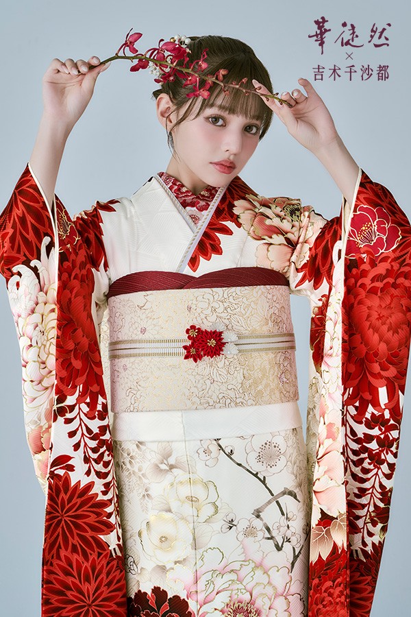 深紅の乱菊に淡い色目の牡丹や梅が重ねて描かれ、華麗さと品格を兼ね備えたお振袖。