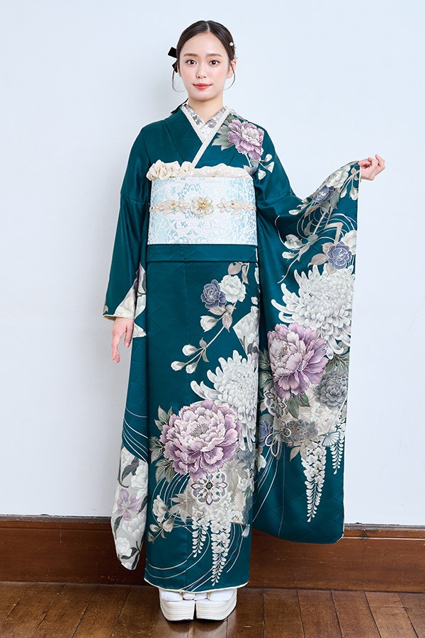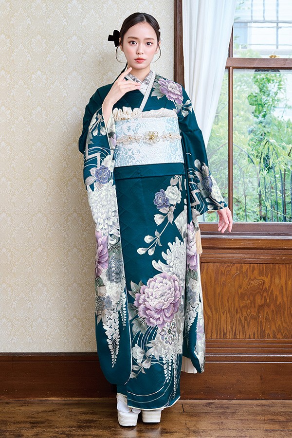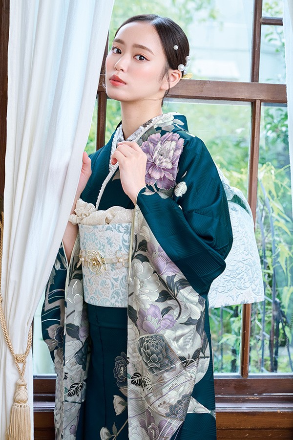 深く落ち着いたフォレストグリーンに、高貴な紫の牡丹が咲き誇る印象的な振袖です。