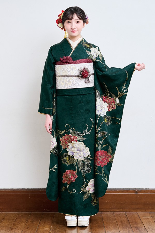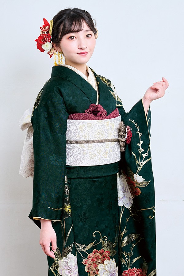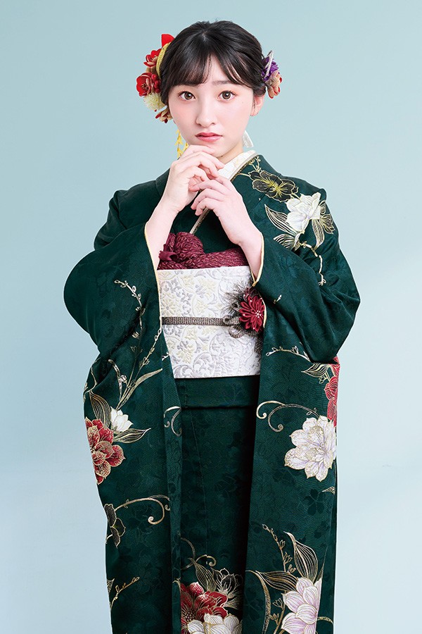 落ち着いた印象の中に上品さも光る深緑のお振袖。深紅とホワイトで描かれた大輪の花がスタイリッシュな印象を与えます。
