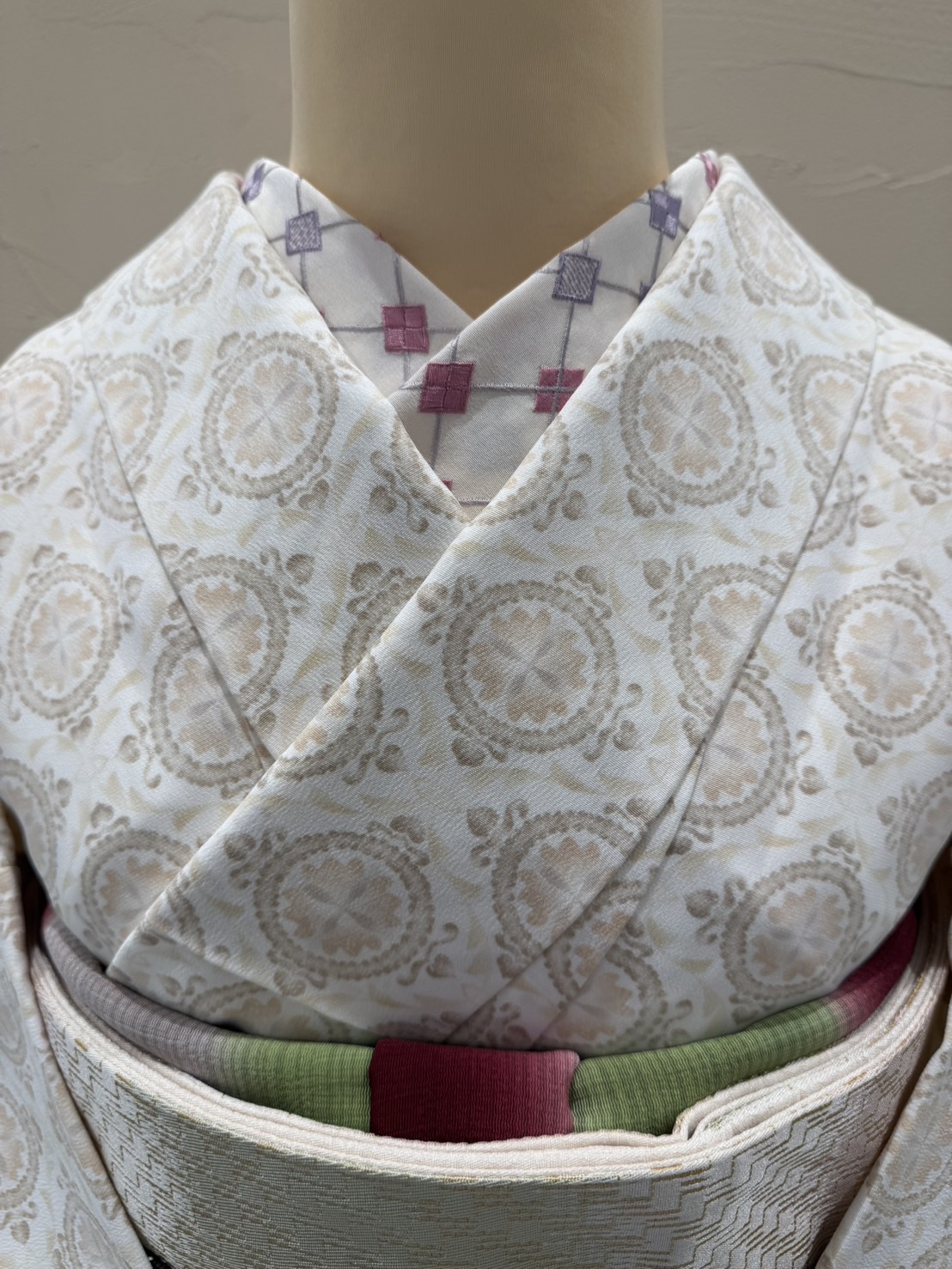 主張しすぎない優しい色合いは、帯合わせ次第で幅広くコーディネート出来ます。